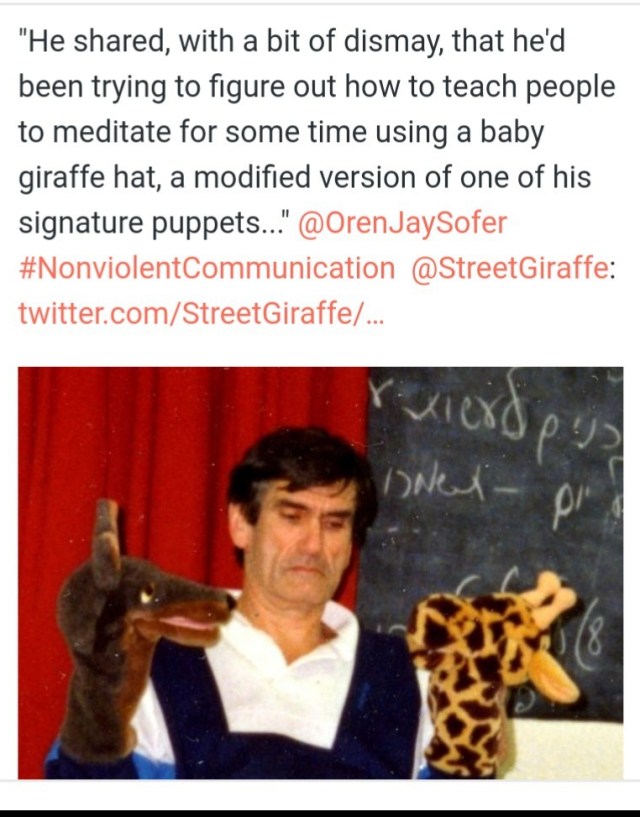 Later another workshop participant, who had gone to a toy store during a break, brought a jackal puppet back for Marshall — which at first seemed merely a playful joke (surely to then be re-gifted to a child) — but then, again spontaneously, Marshall opted to use it (almost as a magician might pull a rabbit out of a hat, theatrically) during a demonstration on how to deal with (jackal-esque) judgments and, once again, enjoyed the liveliness that ensued. (As in the days of ancient theater replete with the embellished narration of a Greek chorus, the drama of a jackal puppet — bearing witness to the ‘jackal show’ — is nothing new under the sun.)