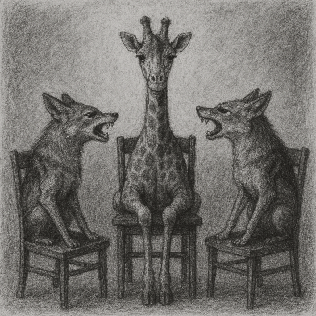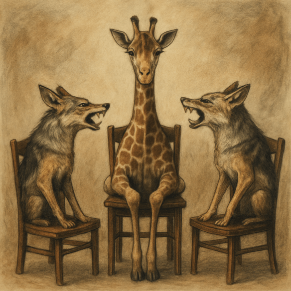 At the seven minute mark (of the YouTube above) Marshall — seated beside Ann Weiser Cornell — says, “Deep breath. You see… Now this giraffe is glad that it has practiced focusing because it’s spent a lot of time learning how to get in touch with its feelings and needs and it can give itself some emergency first aid empathy right now to deal with what’s going on so that it can then focus its attention on the other person again.”
