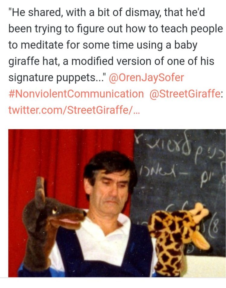 "I'm going to show you a technology today which takes insults and criticisms out of the airwaves. (Marshall puts on giraffe ears) With this technology, it will be impossible for you to hear criticisms, harsh remarks, or insults. All you can hear is what all people are ever saying, 'please' and 'thank you'. What used to sound like criticism, judgment, or blame, you will see, are really tragic, suicidal expressions of 'please'." ~ Marshall B. Rosenberg