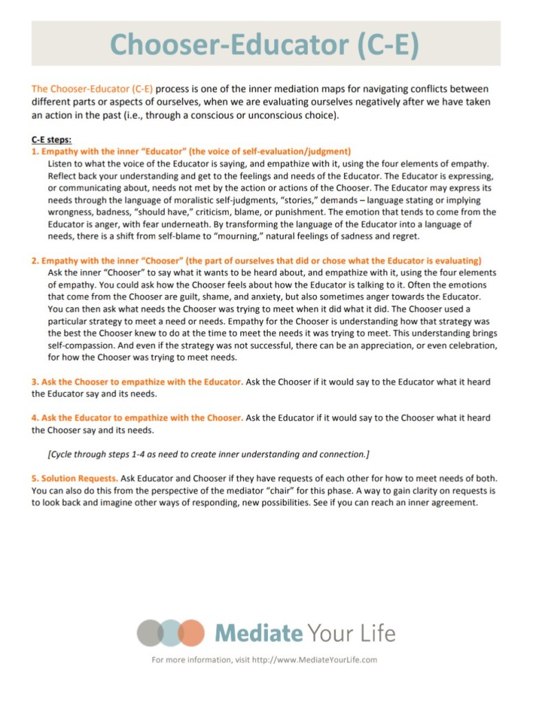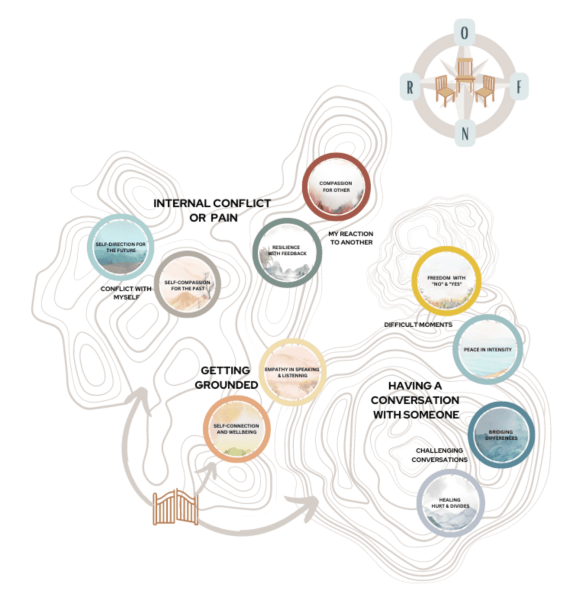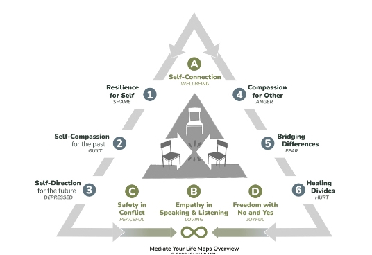 In our Mediate Your Life training, we offer what is called a Self-Connection Process. This process integrates mindfulness with language components of Compassionate Communication (Nonviolent Communication/NVC), and a 3-chair mediation framework that provides different processes we call “maps” to navigate life’s challenges and difficult conversations.