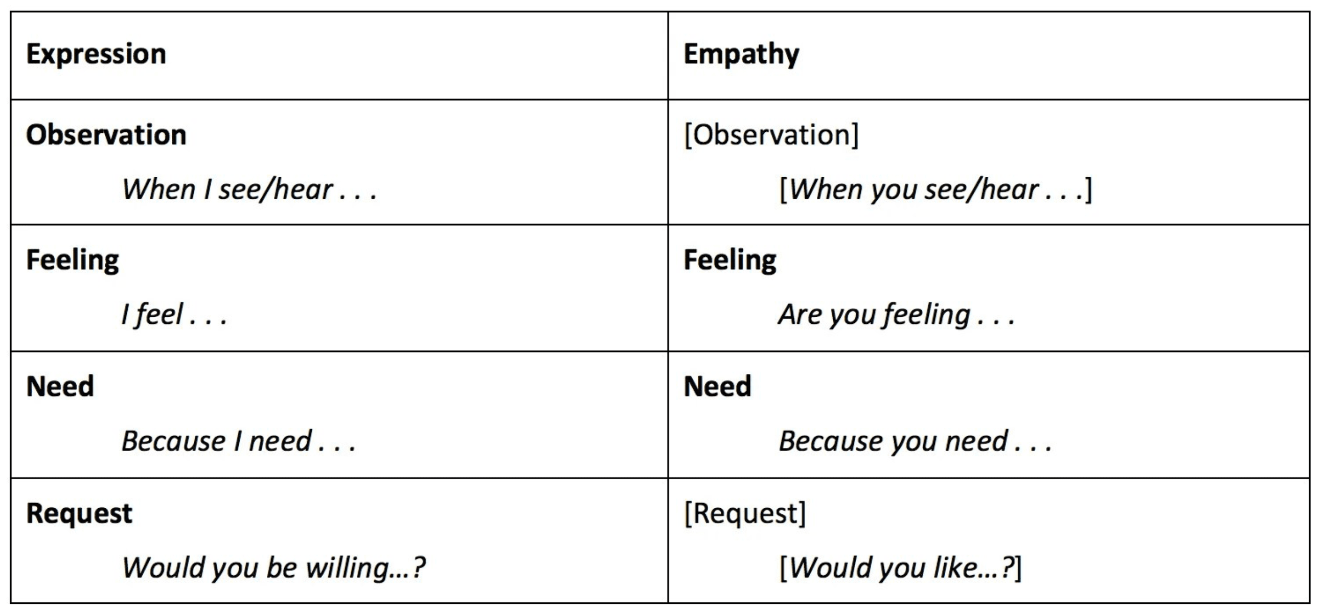 empathetically listening: observations feelings needs requests |