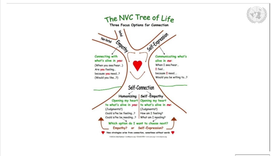 Inbal Kashtan’s NVC Tree of Life with U.N. insignia as presented at the United Nations on May 17, 2019 (#NVC2UN)