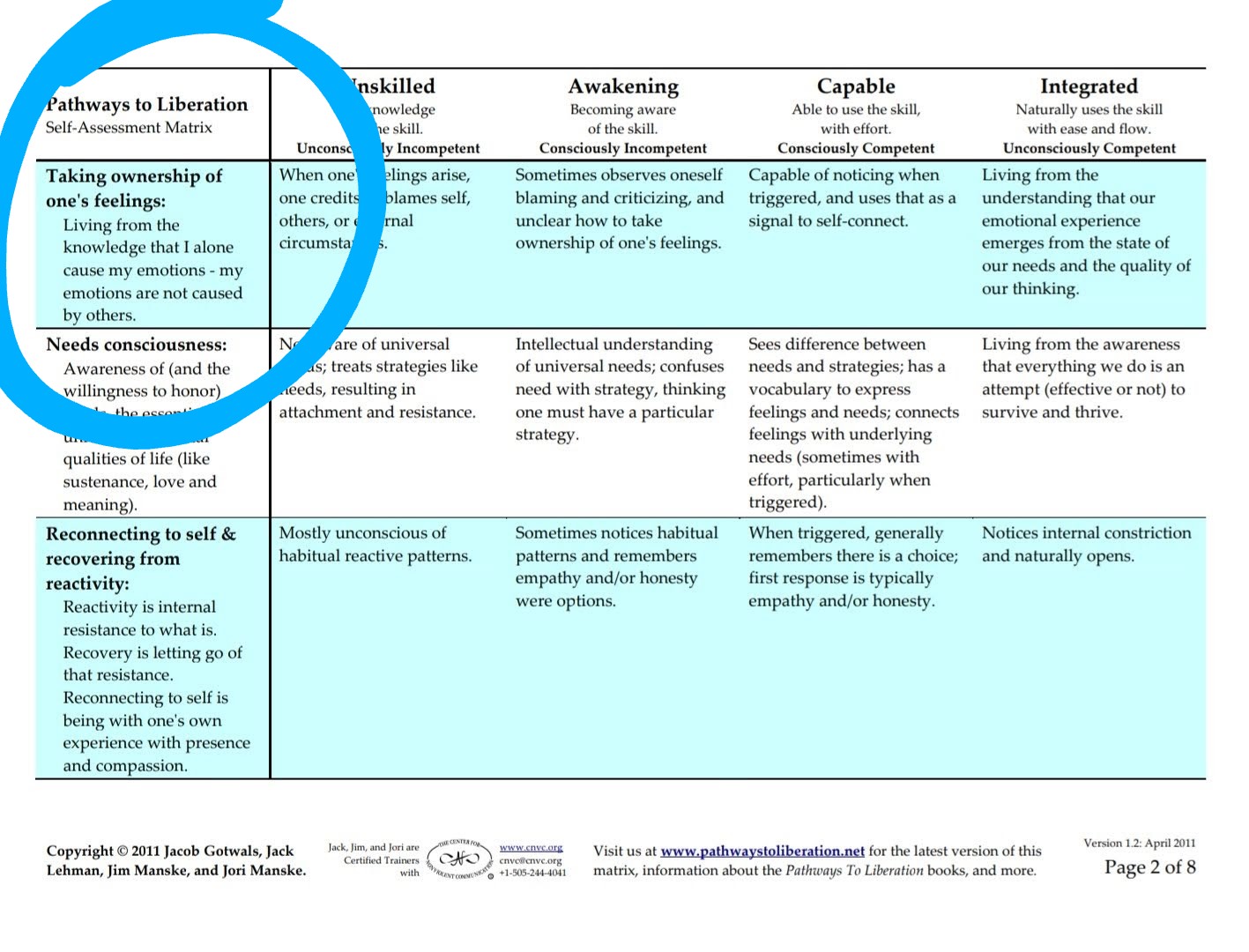 | Capable Able to use the skill, with effort. Consciously Competent | Able to take ownership of ones experience and choices when one becomes aware of blaming, justifying, or minimizing, without trying to take ownership of others reactions and responses. |